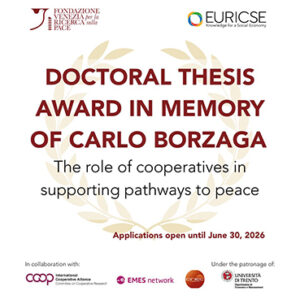 La Fundación Veneciana para la Investigación sobre la Paz y EURICSE han abierto la convocatoria al Premio a la mejor tesis doctoral en memoria del profesor Carlo Borzaga. El premio está patrocinado por la Universidad de Trento y se promueve en colaboración con el Comité de Investigación Cooperativa de la Alianza Cooperativa Internacional (ACI, CCR), la red internacional de investigación EMES y CIRIEC-International.