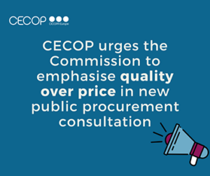 CECOP-CICOPA Europa ha dirigido un escrito a la Comisión Europea en el que pide que las autoridades comunitarias den más importancia a la calidad y menos al precio en los pliegos sobre contratación pública. En el mismo escrito, CECOP propone una serie de recomendaciones para mejorar la relación con las empresas de economía social y las cooperativas, como eliminar cargas administrativas o aclarar, en los casos en los que sea necesario, los motivos de exclusión de ofertas presentadas.